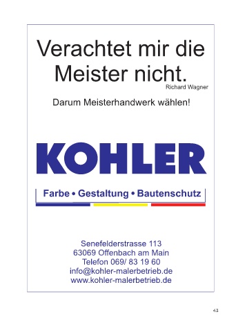 Verachtet mir die Meister nicht. Richard Wagner Darum Meisterhandwerk wählen! Senefelderstrasse 113 63069 Offenbach am Main Telefon 069/ 83 19 60 info@kohler-malerbetrieb.de www.kohler-malerbetrieb.de 43